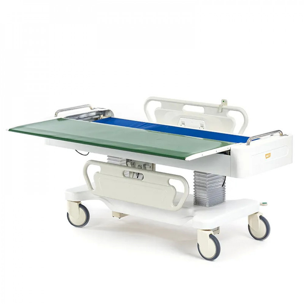 - Безопасность и доступ: Опускающиеся боковые ограждения из прочного АВS-пластика обеспечивают беспрепятственный доступ к пациенту и его безопасность во время движения.