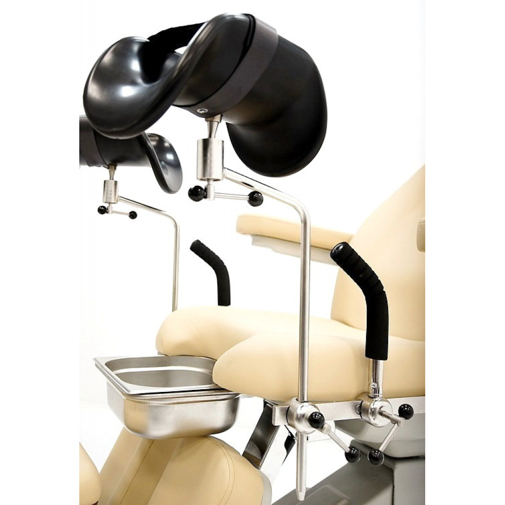 - Пациентский комфорт: Контурное анатомическое сиденье (ширина 51 см, глубина 58 см) и спинка имеют наполнение из ППУ в обивке из гипоаллергенной экокожи. Предусмотрены сдвижные рукоятки для пациентки, поднимающиеся подлокотники и регулируемый мягкий подголовник.