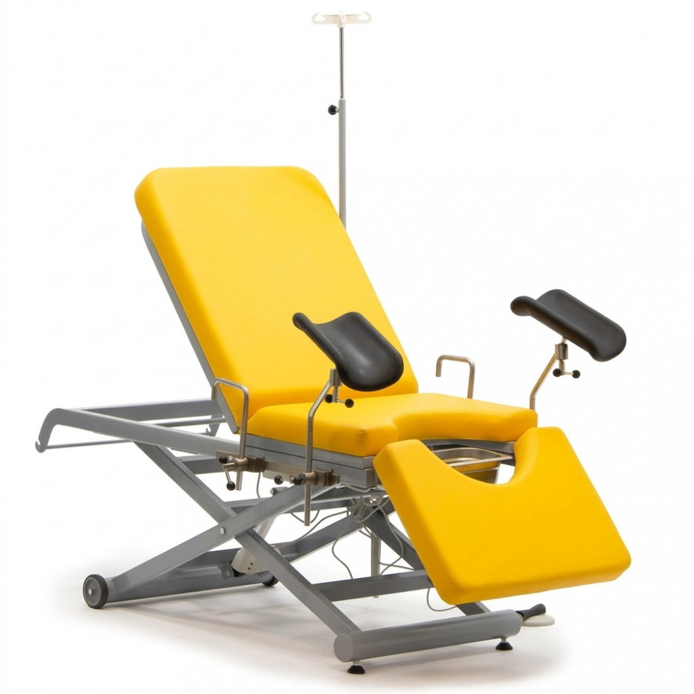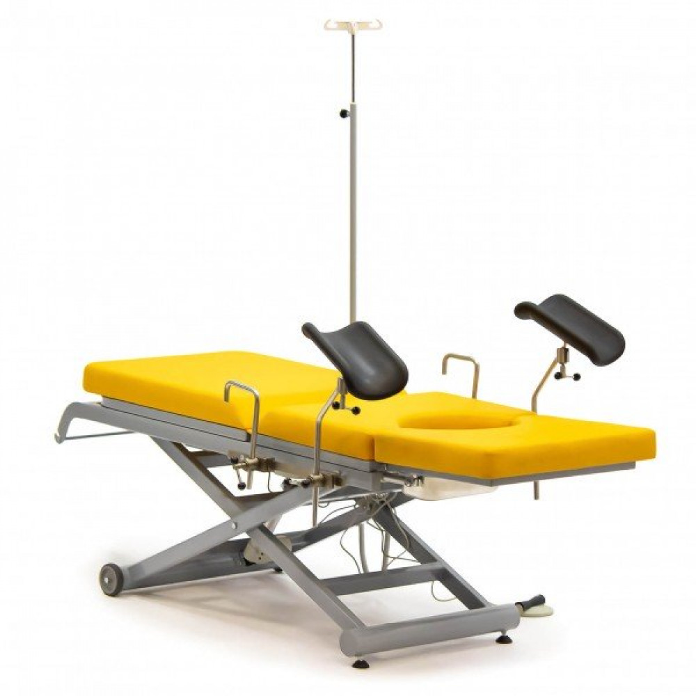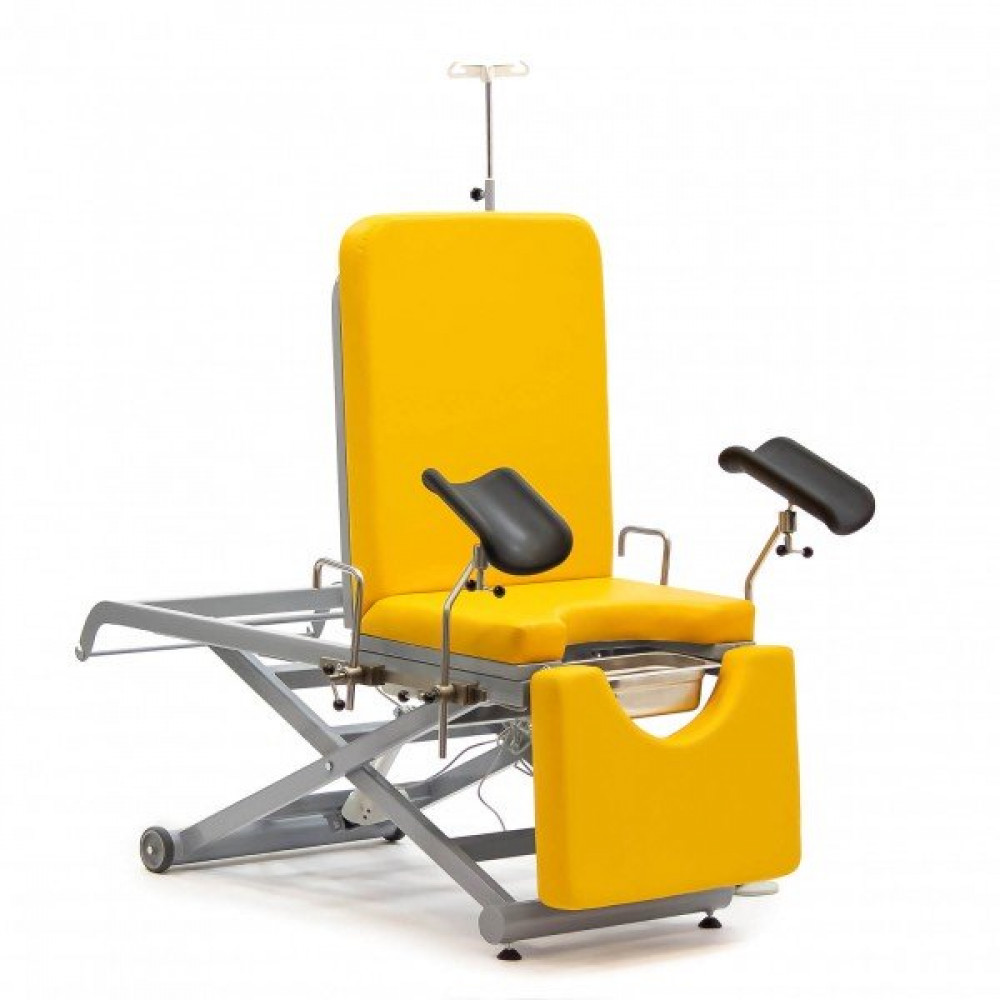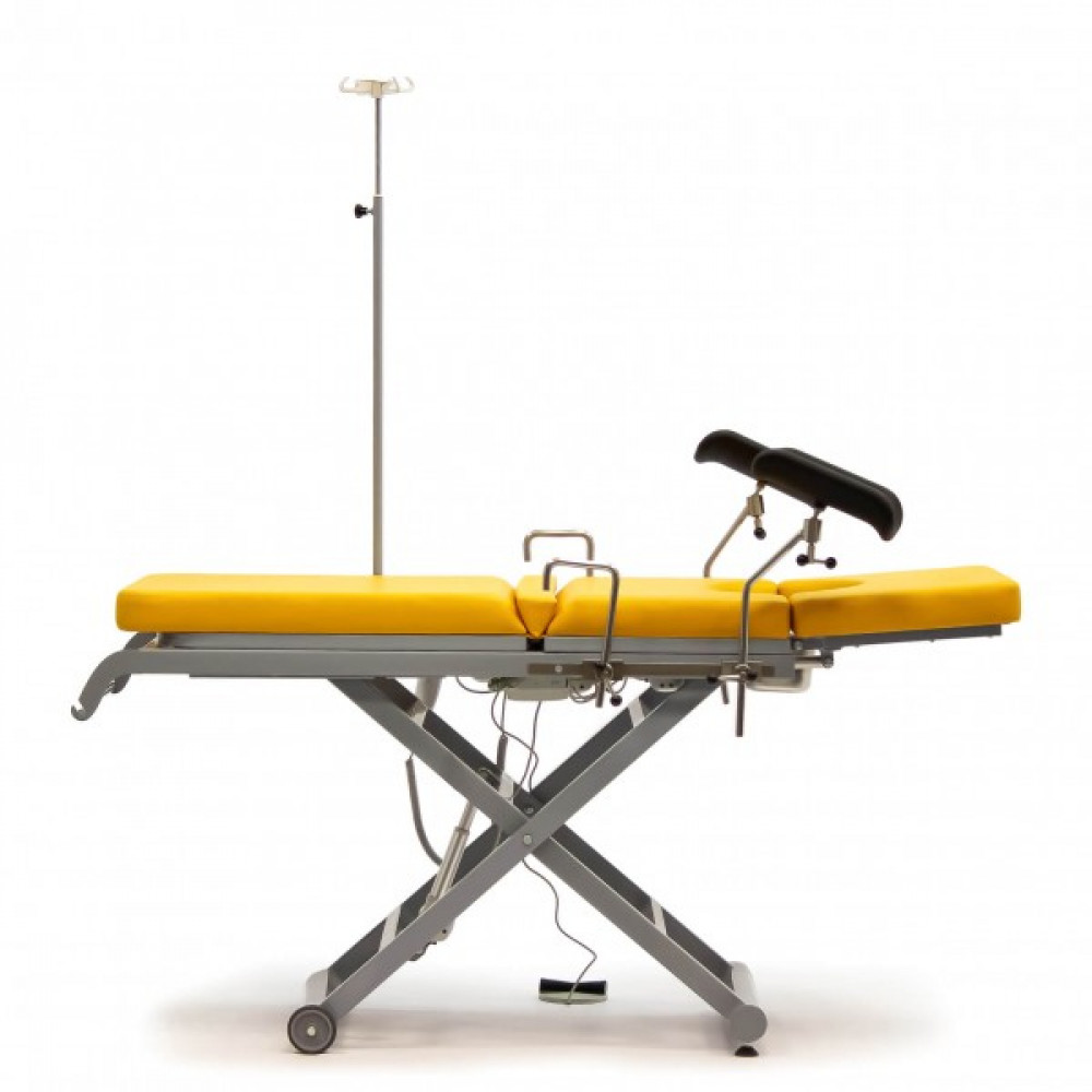 Главное преимущество модели — комплексное решение: в комплект входит само гинекологическое кресло-кровать, стул для врача, инфузионная стойка и ножная педаль для регулирования высоты.