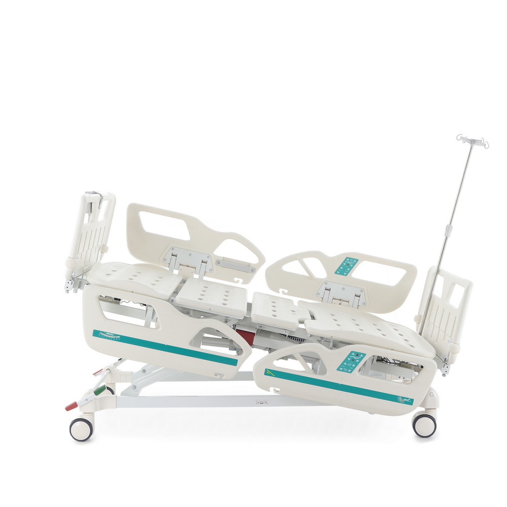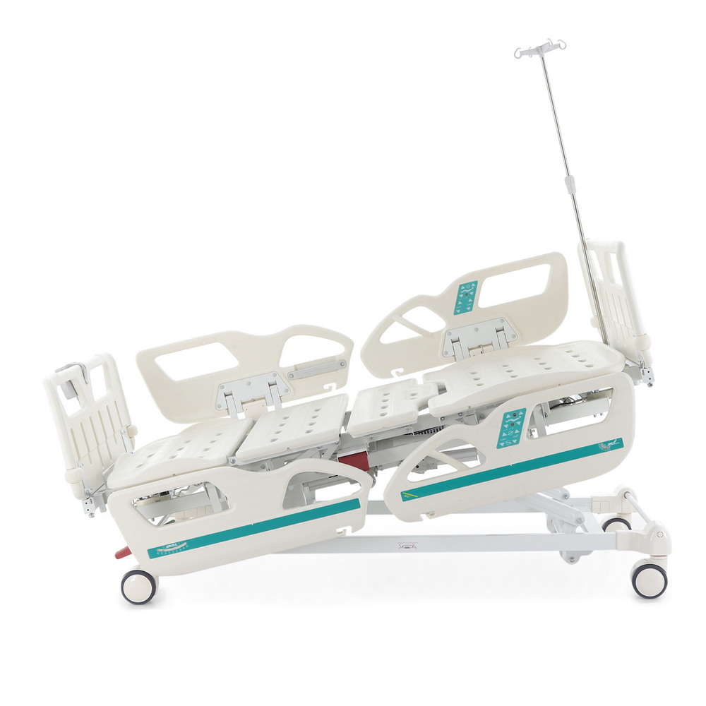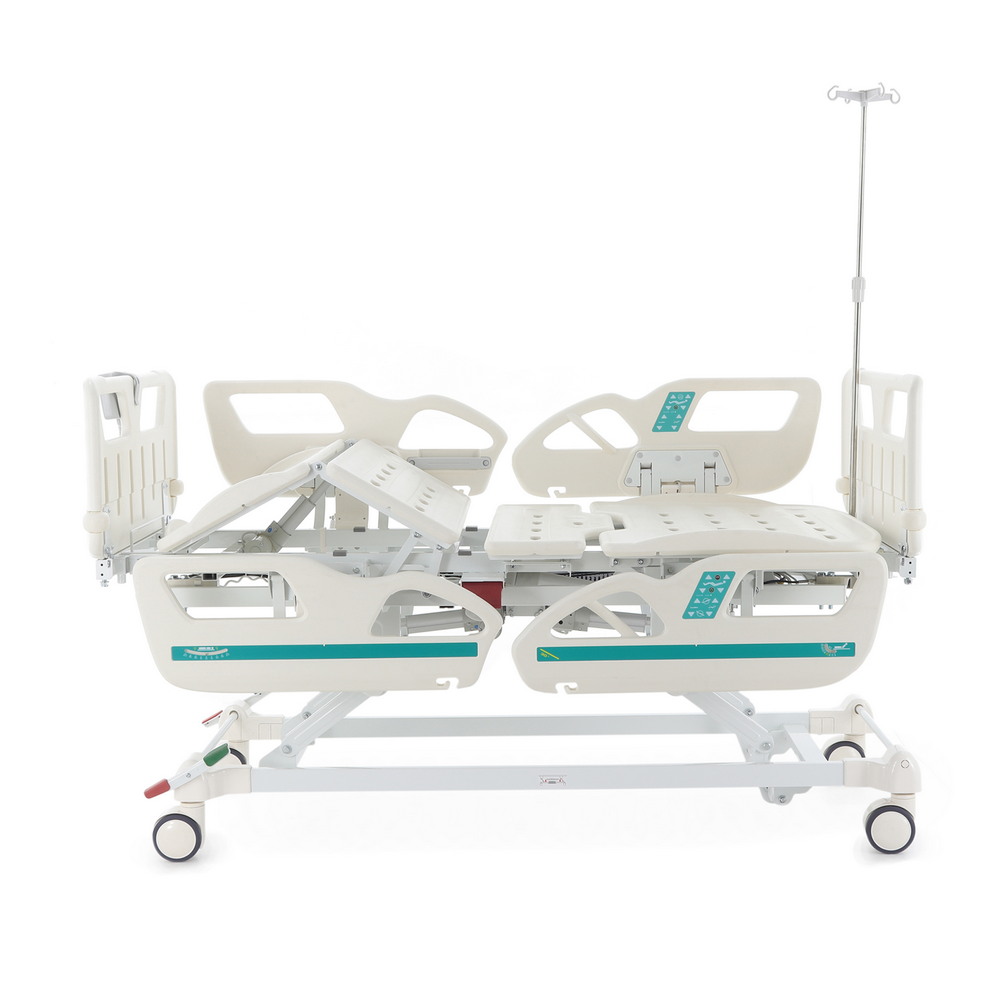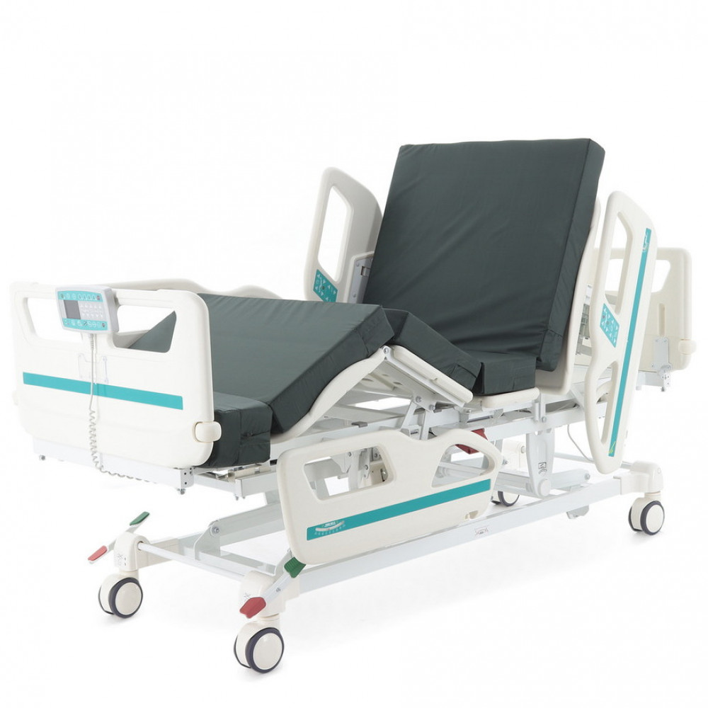 - Боковые Ограждения и Управление: Кровать оснащена четырьмя откидными боковыми ограждениями из ABS-пластика, которые имеют механизм плавного складывания с газовыми упорами и автоматическую фиксацию. В ограждения встроены угломеры для точного контроля.