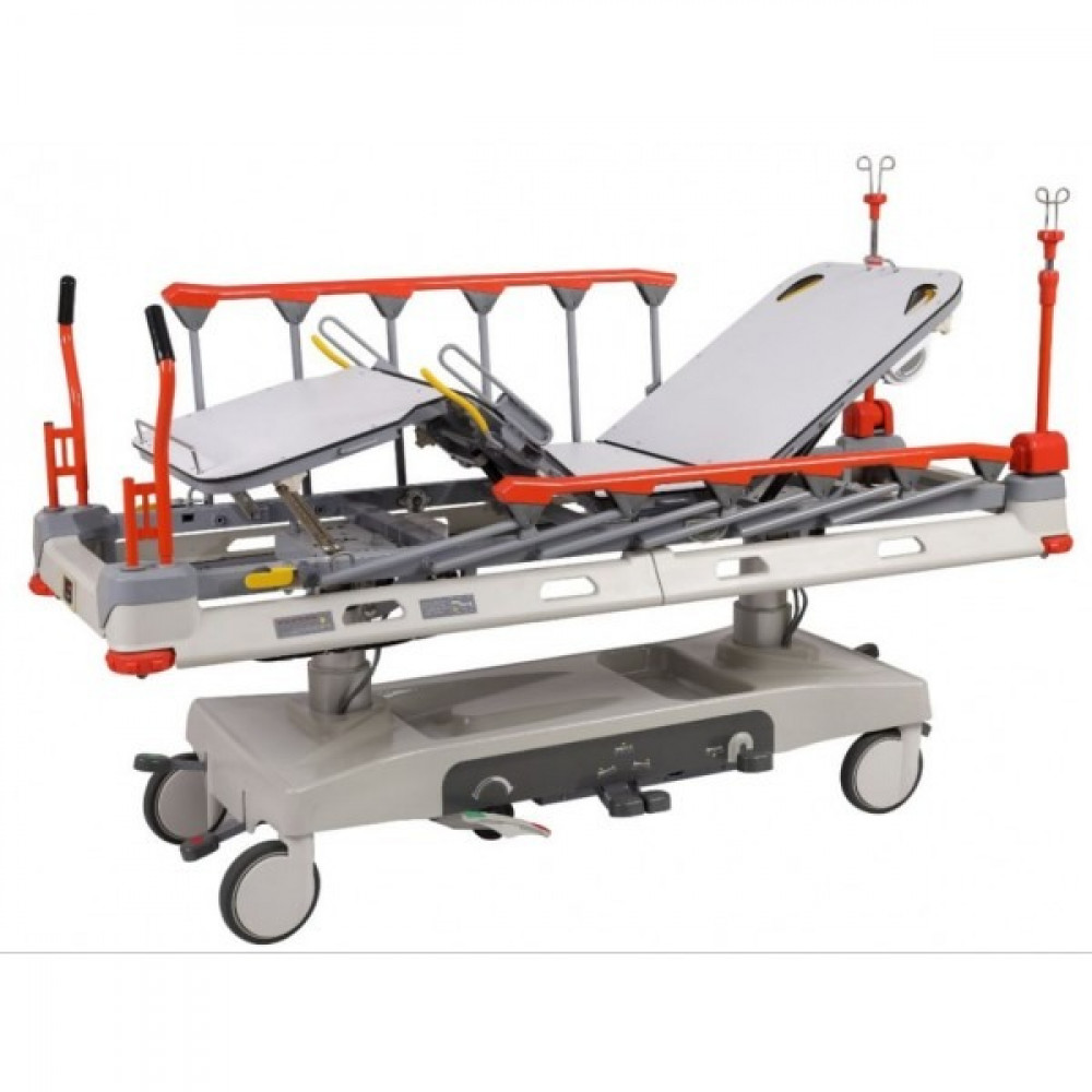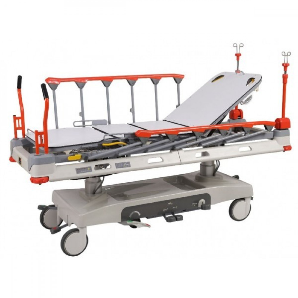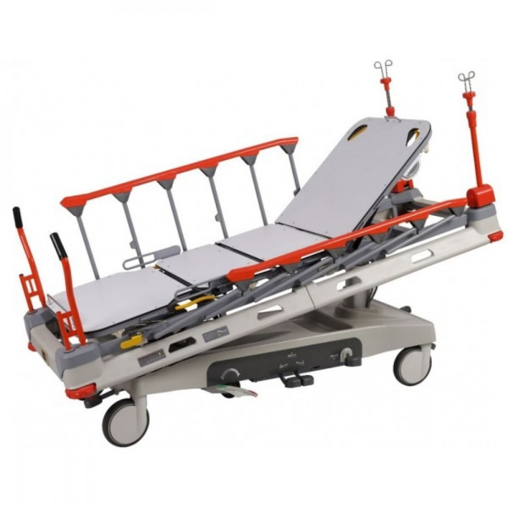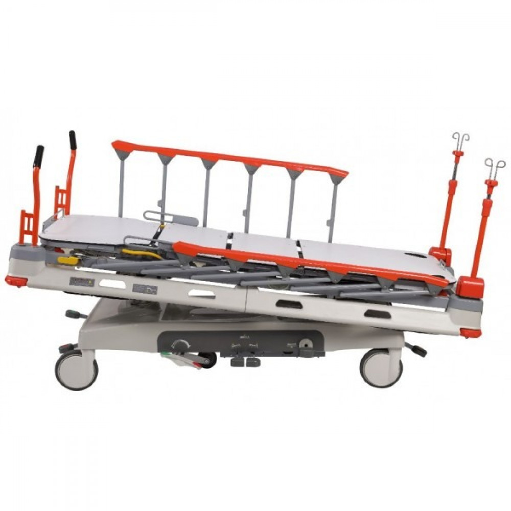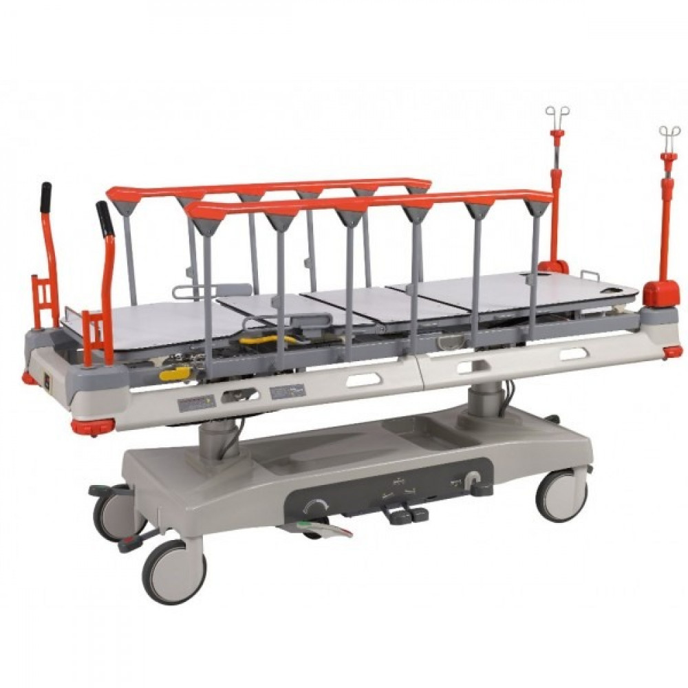 - Безопасность пациента: Складывающиеся боковые ограждения из нержавеющей стали обеспечивают 100% безопасность. 4 угловых бампера амортизируют удары при транспортировке.