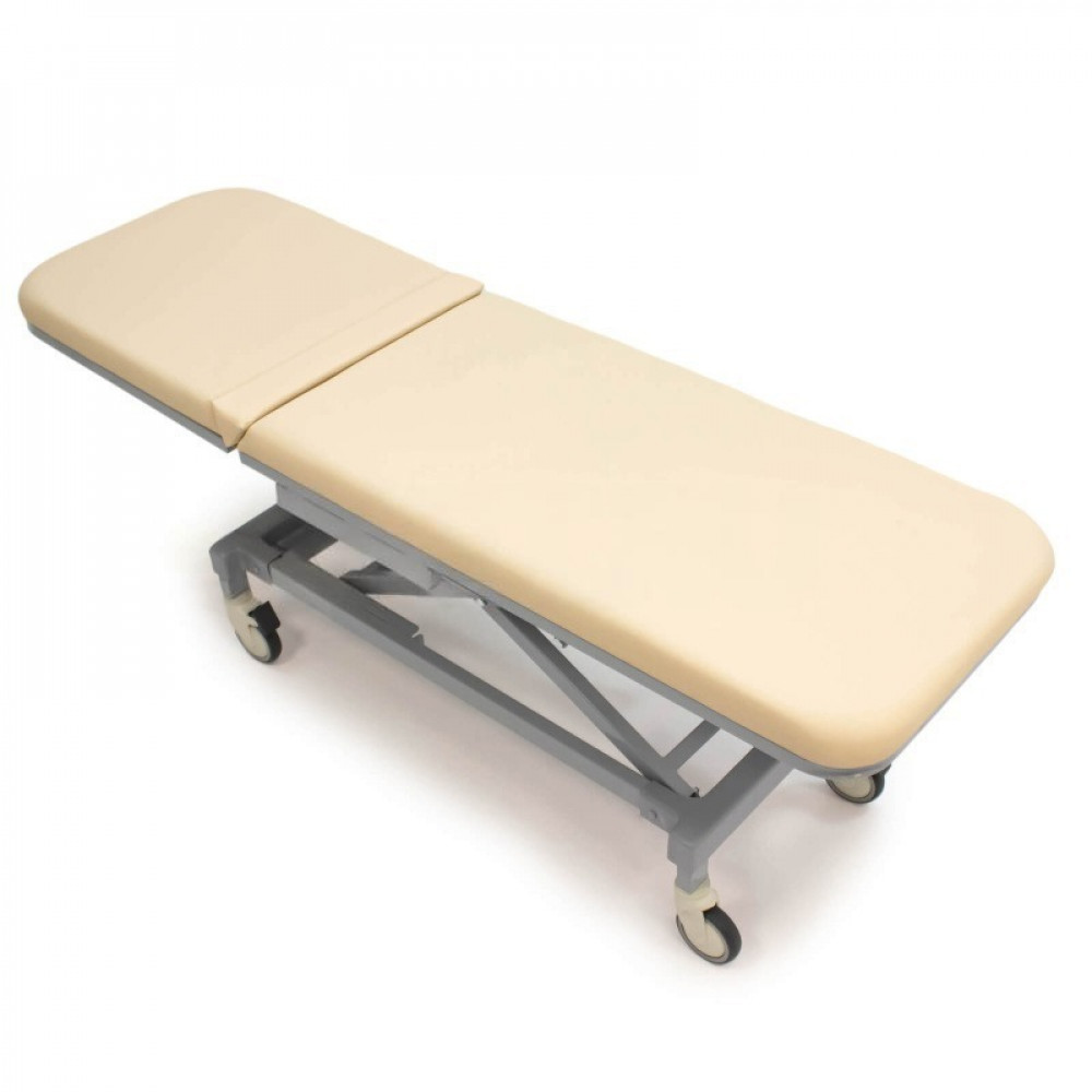 - Широкие возможности позиционирования: Стол состоит из двух секций: основной (125 см) и спинной (72 см). Спинная секция регулируется вручную с использованием газовой пружины (газлифта). Угол наклона спинки имеет широкий диапазон: от -20° до 70°, что позволяет быстро переводить пациента из горизонтального положения в сидячее и даже в положение Тренделенбург (при отрицательном наклоне).