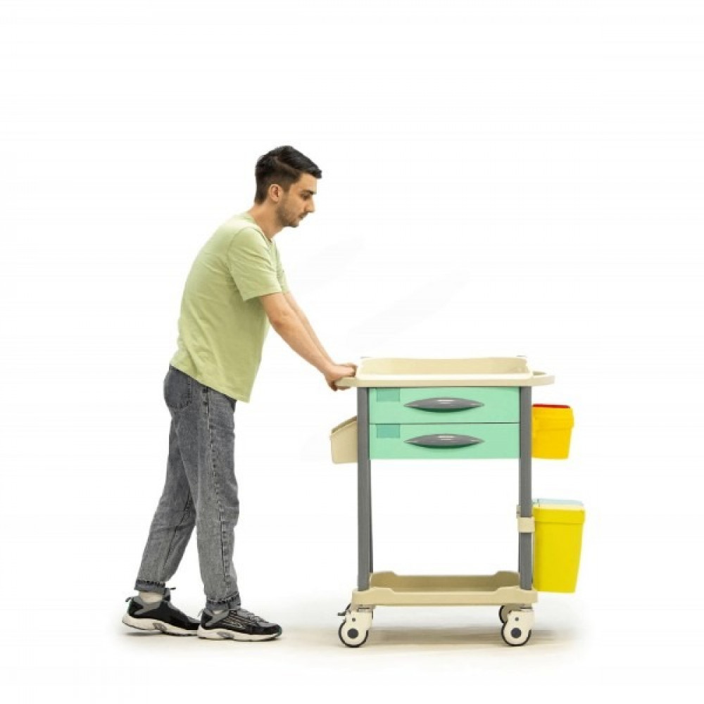 - Маневренность: Перемещение медицинской тележки обеспечивается самоориентирующимися колесами. Для надежной фиксации предусмотрены тормоза-фиксаторы на двух колесах, расположенных по диагонали.