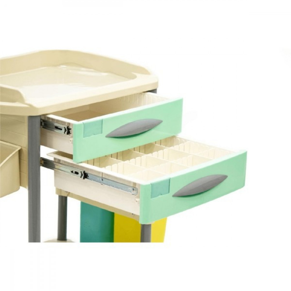 - Организация и хранение: Модель оснащена двумя выдвижными ящиками, каждый из которых имеет встроенные разделители, позволяющие максимально эффективно и аккуратно организовать хранение медикаментов и инструментов.