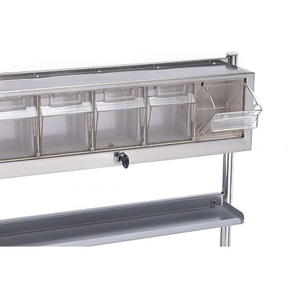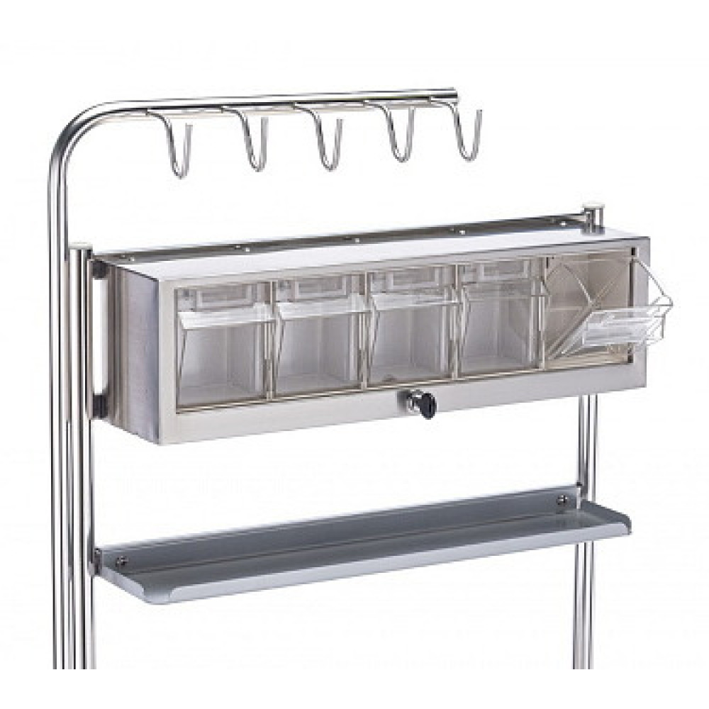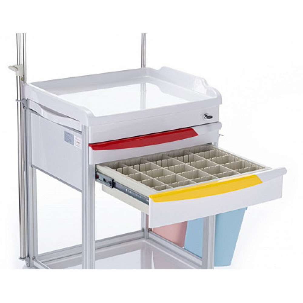 - Рабочие поверхности и хранение: Тележка оснащена удобной рабочей поверхностью с бортиками по трем сторонам. Над столешницей расположена надстройка с 5-ю ящиками, обеспечивающая быстрый доступ к мелким предметам и лекарствам. В основании тележки есть открытое отделение для габаритных предметов.