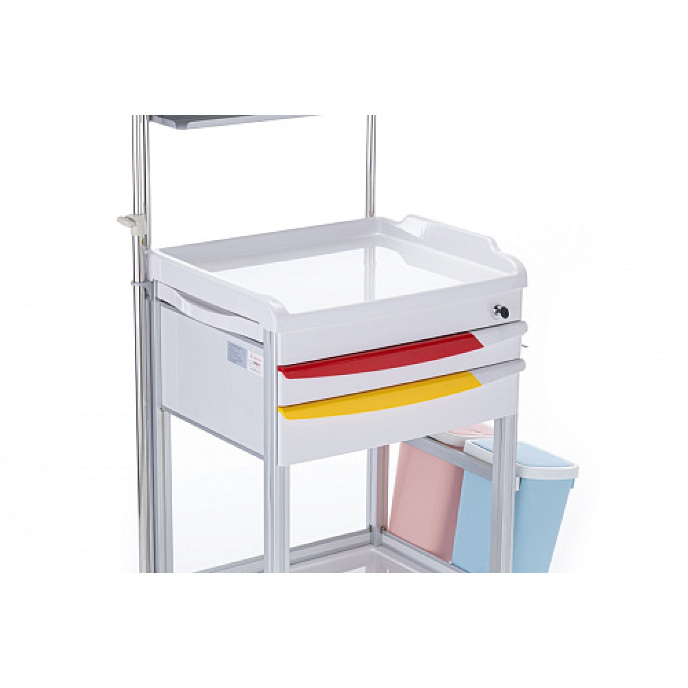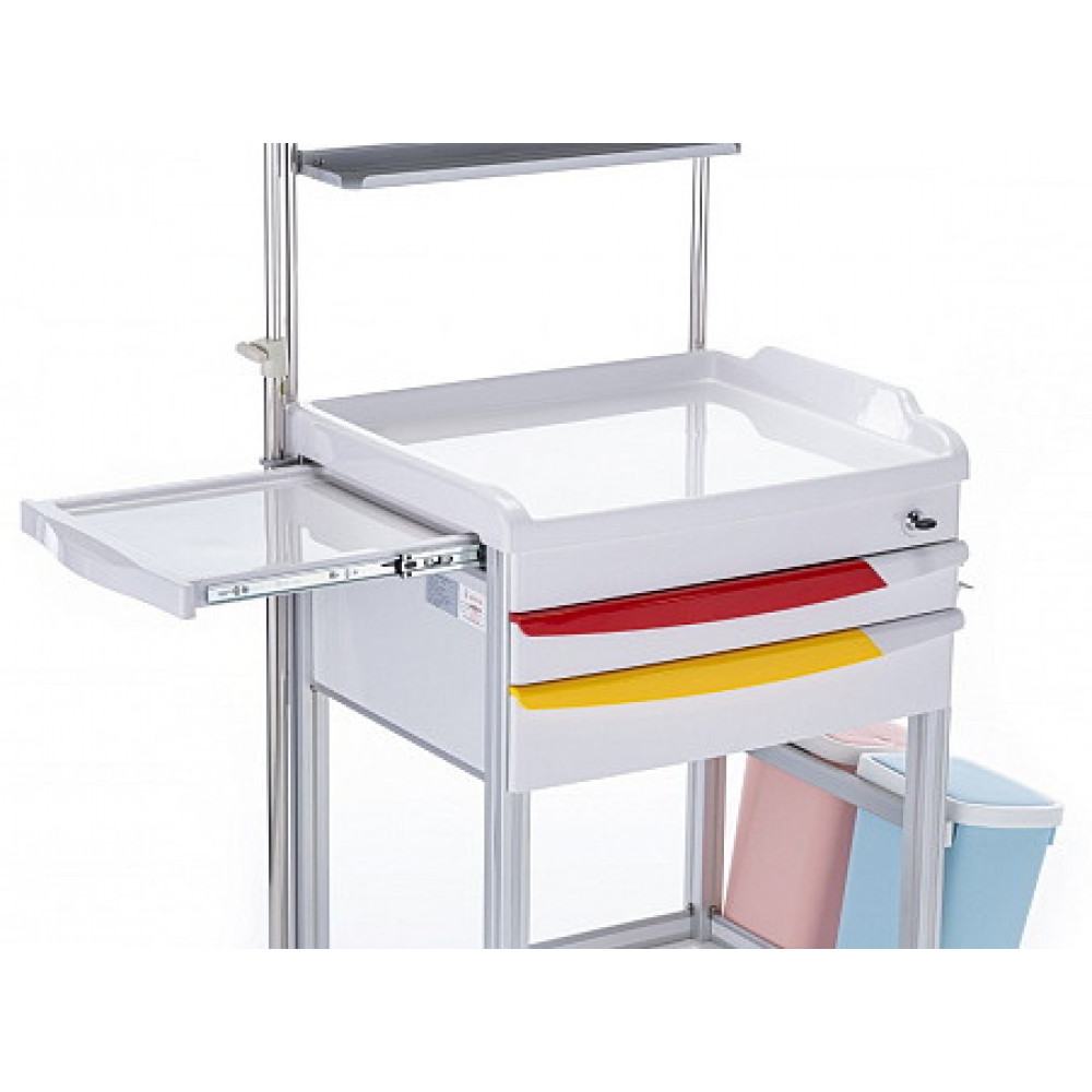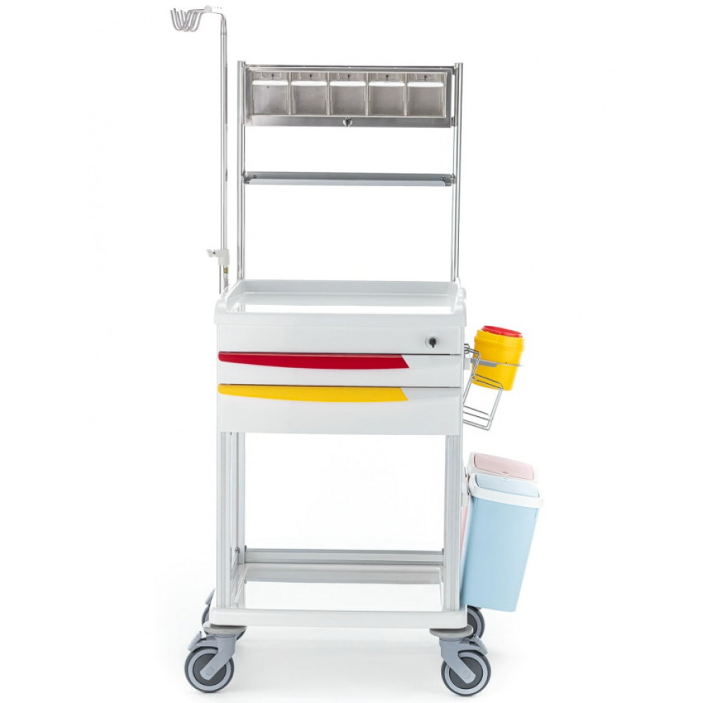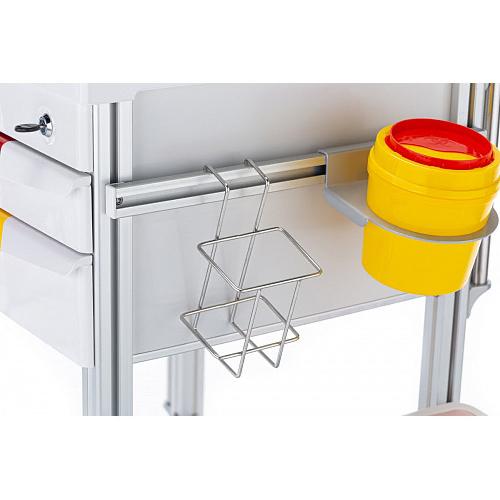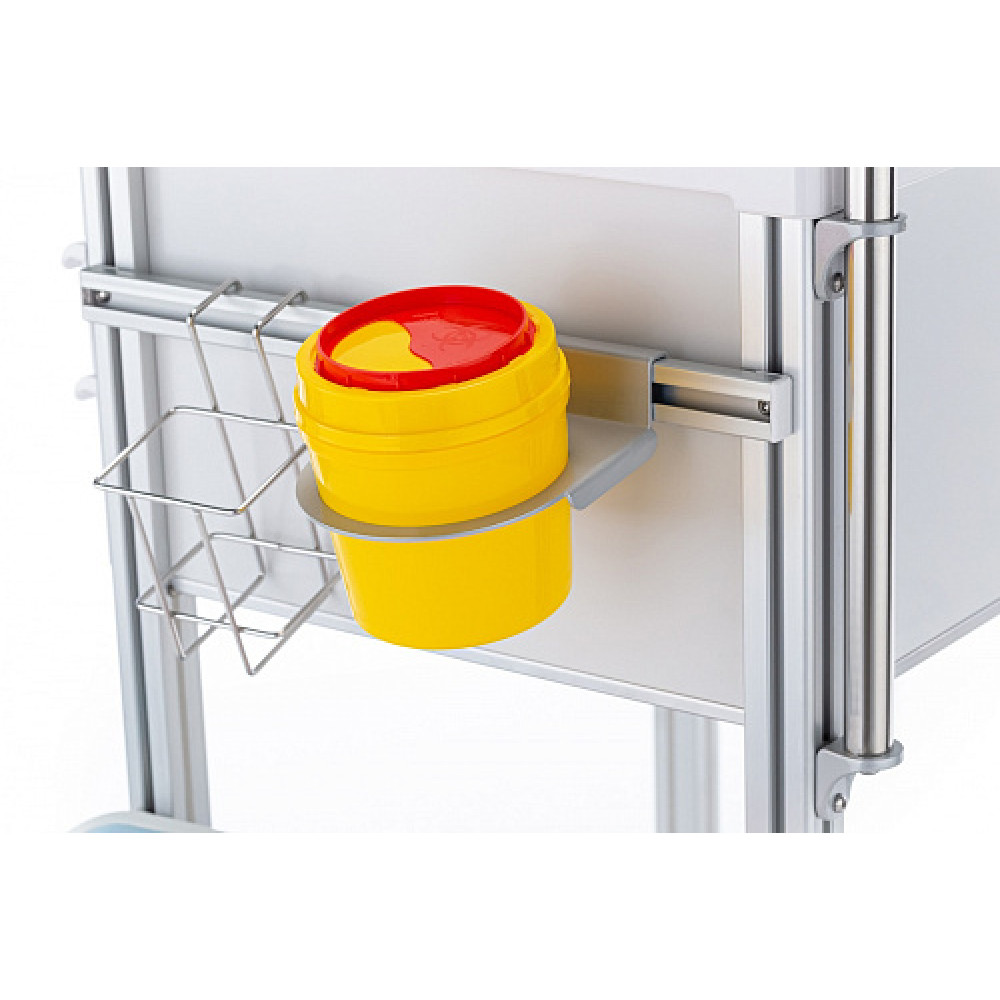 - Гигиена: Тележка оснащена 2 пластиковыми емкостями для отходов с функцией открывания push up, а также специальной емкостью для использованных игл и держателем для дезинфицирующего средства.