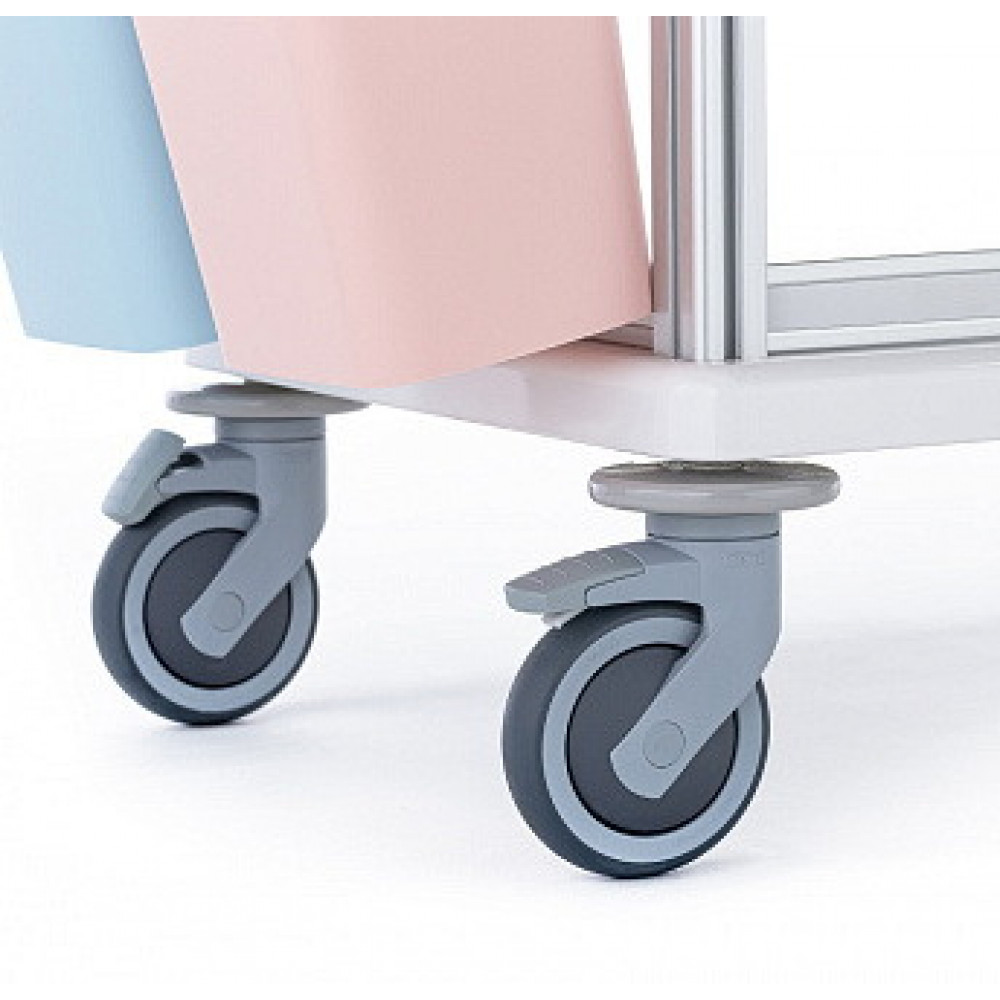 - Маневренность: Тележка легко перемещается на самоориентирующихся колесах диаметром 125 мм. Каждое колесо оснащено индивидуальным тормозом для надежной фиксации.