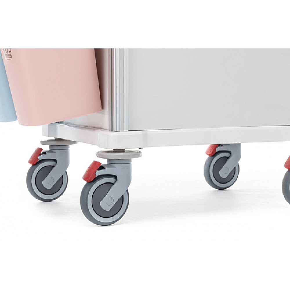 - Легкость и маневренность тележки достигаются благодаря самоориентирующимся колесам диаметром 125 мм. Каждое колесо имеет индивидуальный тормоз для надежной фиксации на месте.