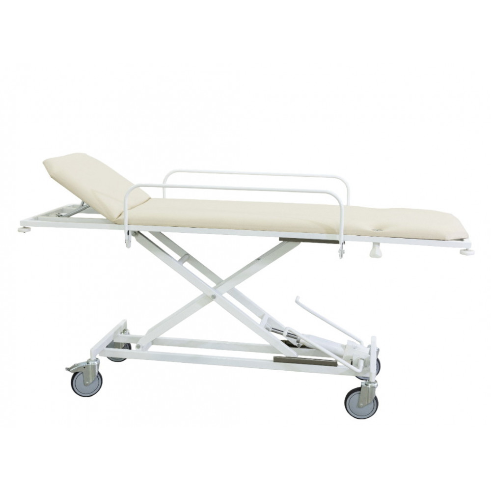 - Защита пациента: Тележка оснащена надежными откидывающимися боковыми ограждениями, которые исключают риск падения пациента при движении.