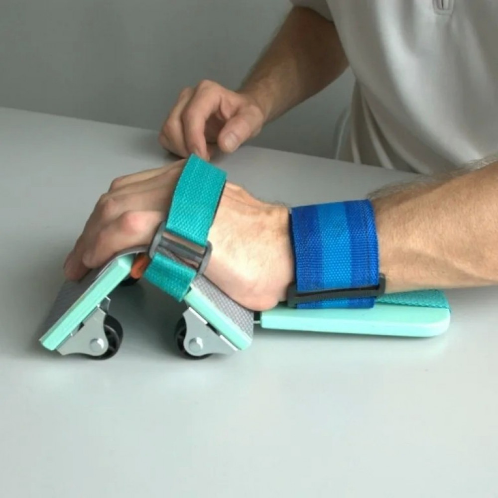 - Отработка движений: Опора на четыре колеса позволяет сознательно изменять направление движения тренажера по поверхности. При этом в работу включаются различные мышцы и суставы руки, включая мышцы плечевого пояса. Дополнительно нагружаются мышцы пресса, что способствует укреплению кора.