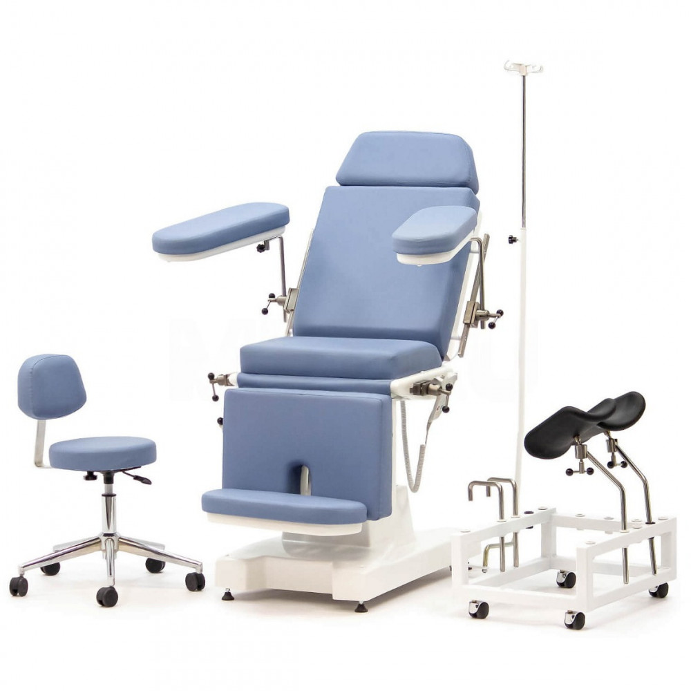- Кресло МЕТ GK 05 поставляется с полной комплектацией для начала работы: в комплект входят само кресло, стул для врача, платформа для аксессуаров и инфузионная стойка.